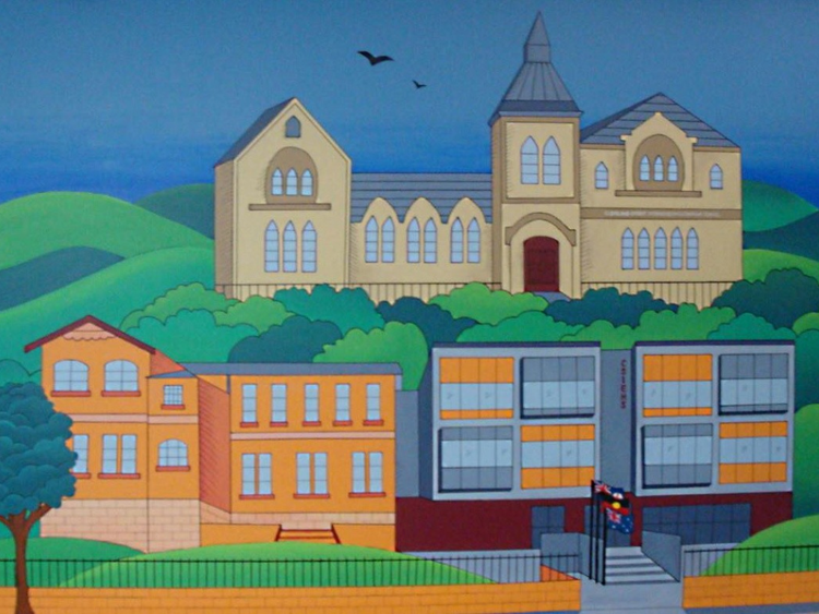 This image of the mural shows the new school in the foreground with the old school in the background honouring the school's 40 years of continuous operation as a provider of quality intensive English.