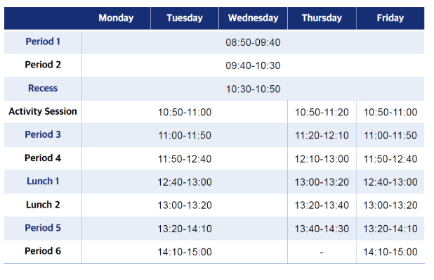 Our school day follows a structured timetable with set times for classes, breaks, and activities. Knowing the bell times helps students make the most of their learning and settle into daily routines.
